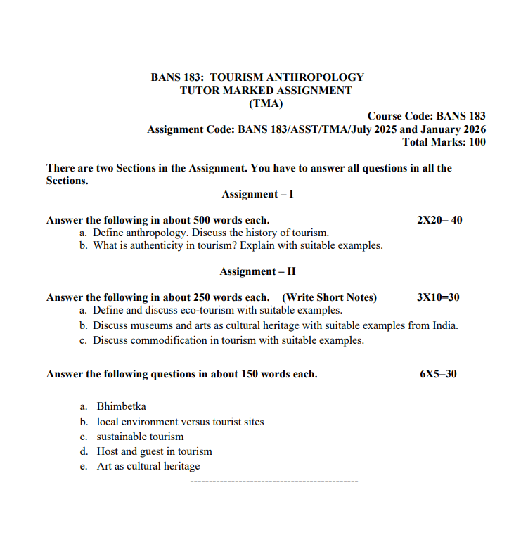 Assignment Title : BANS 183 : TOURISM ANTHROPOLOGY in English Solved Assignment 2025-26