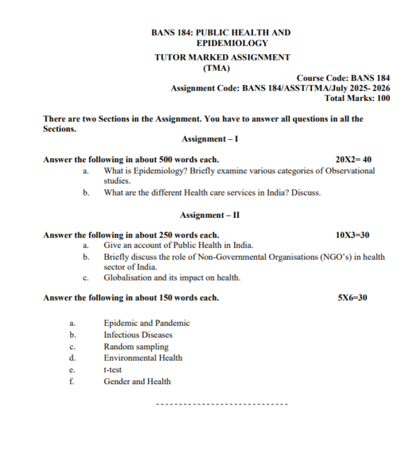 Assignment Title : BANS 184 : PUBLIC HEALTH AND EPIDEMIOLOGY in English Solved Assignment 2025-26
