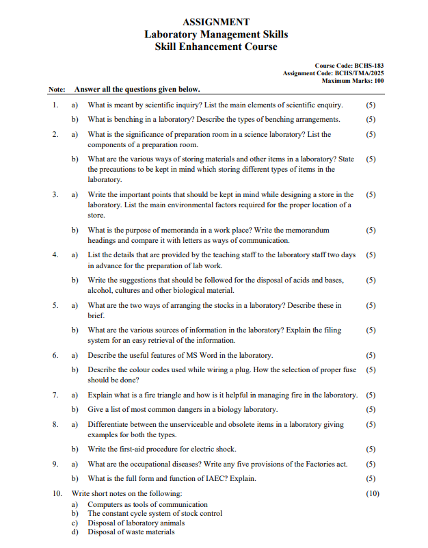 Assignment Title : BCHS 183 : Laboratory Management Skills in English Solved Assignment 2024-25