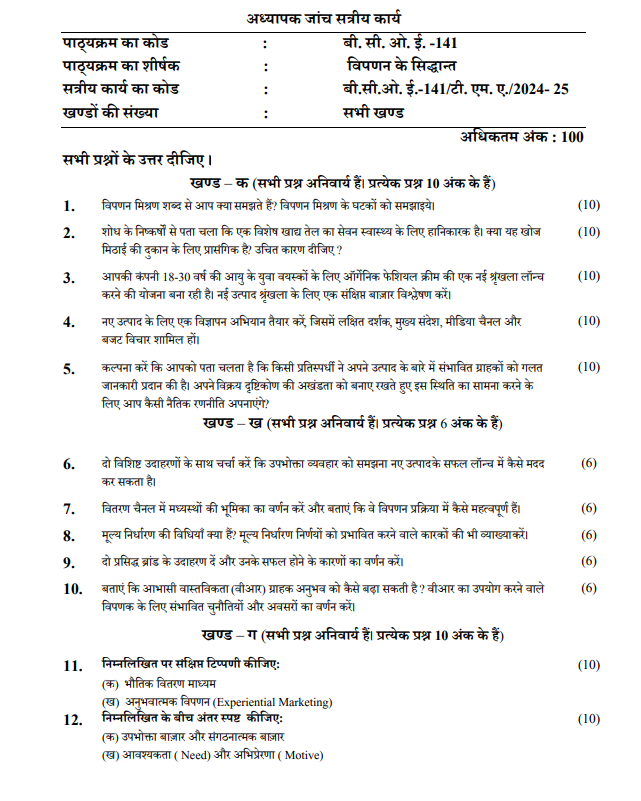 BCOE 141 : विपणन के सिद्धान्त in Hindi Solved Assignment 2024-25