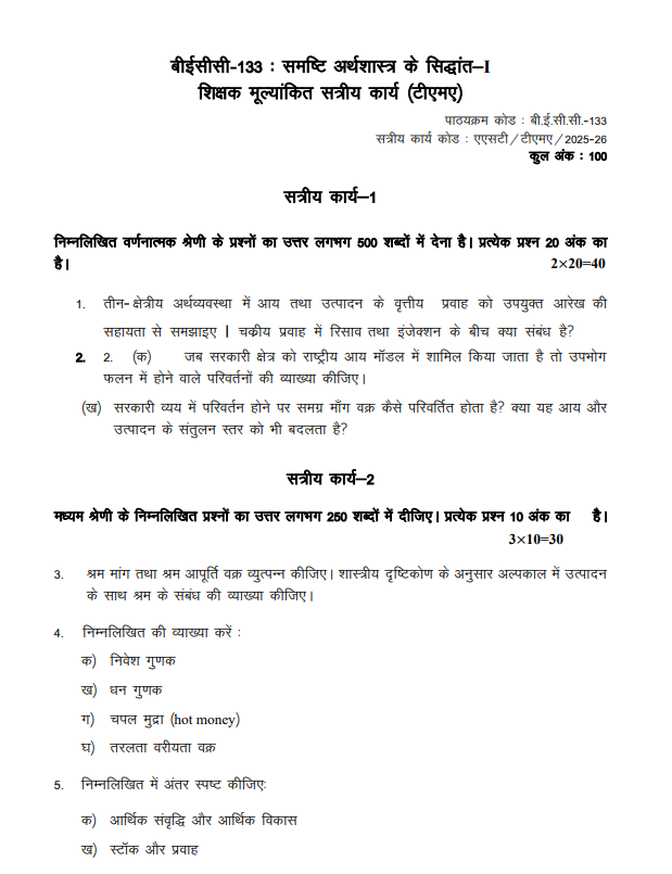 Assignment Title : BECC 133 : समष्टि अर्थशास्त्र के सिद्धांत-1 Solved Assignment in Hindi