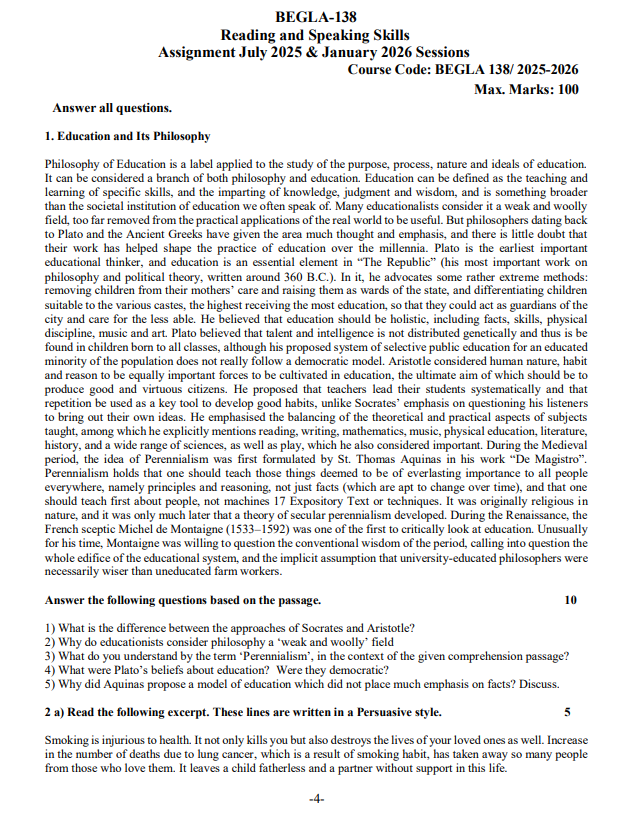 Title : BEGLA 138 : Reading & Speaking Skills Solved Assignment in English 2025-26