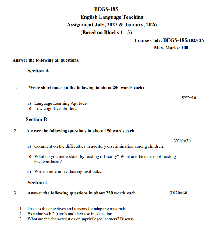 BEGS 185 : English Language Teaching in English Solved Assignment 2025-26