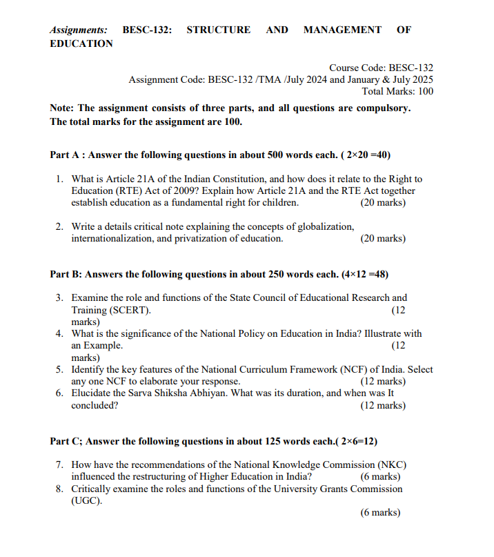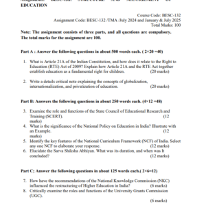 Assignment Title : BESC 132 : Structure and Management of Education in English Solved Assignment 2025-26