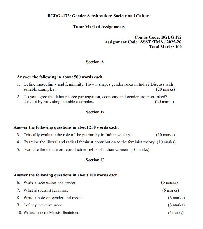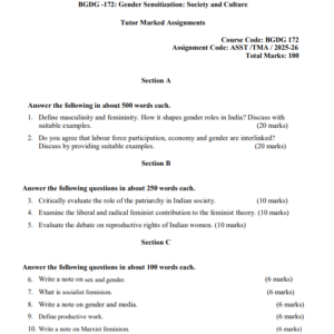 Assignment Title : BGDG 172 : Gender Sensitization : Society and Culture in English Solved Assignment 2024-25
