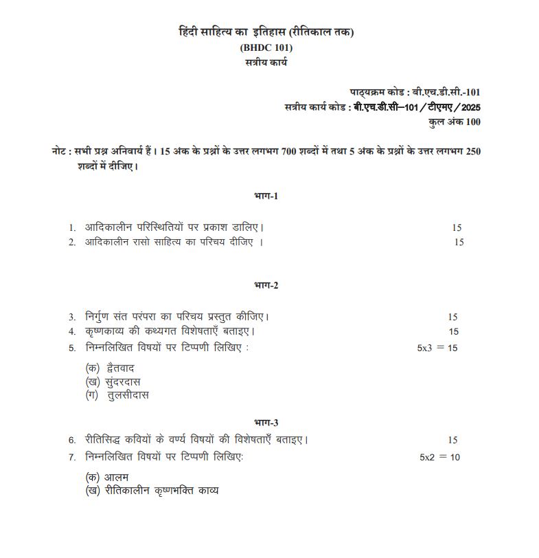 BHDC 101 : हिंदी साहित्य का इतिहास (रीतिकाल) Solved Assignment 2025-26