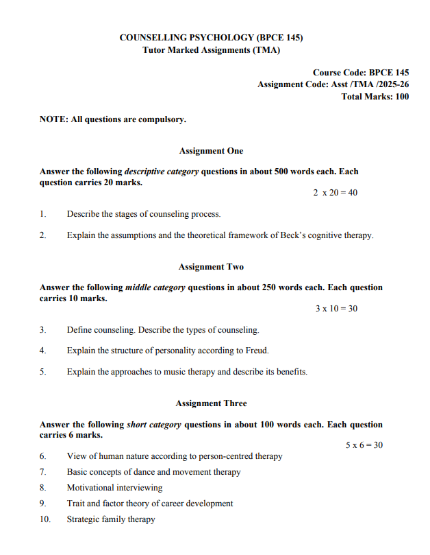 BPCE 145 : Counselling Psychology in English Solved Assignment 2025-26