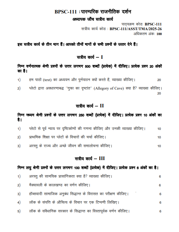 BPSC 111 : पारम्परिक राजनीतिक दर्शन in Hindi Solved Assignment 2025-26