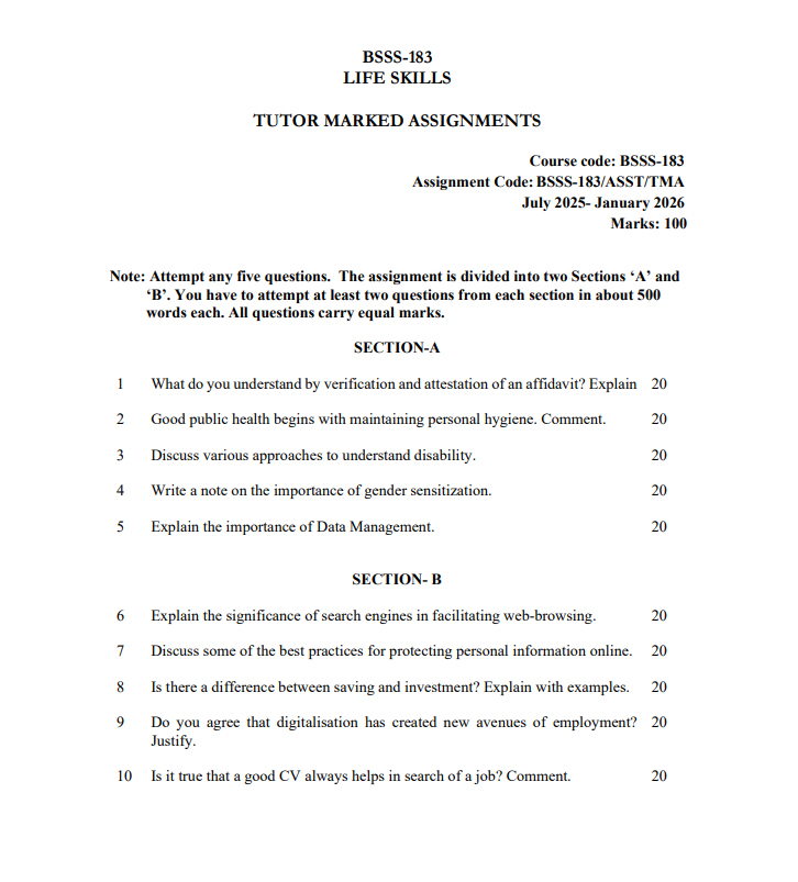 Assignment Title : BSSS 183 : Life Skills in English Solved Assignment 2025-26