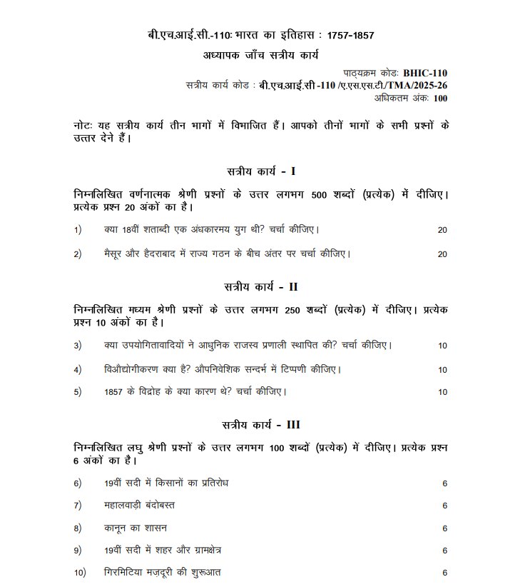 BHIC -110 : भारत का इतिहास (1757-1857) in Hindi Solved Assignment 2025-26