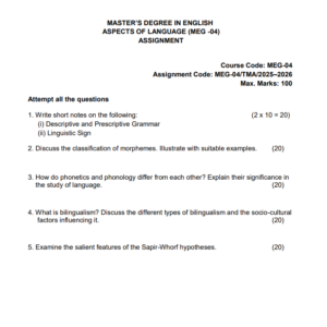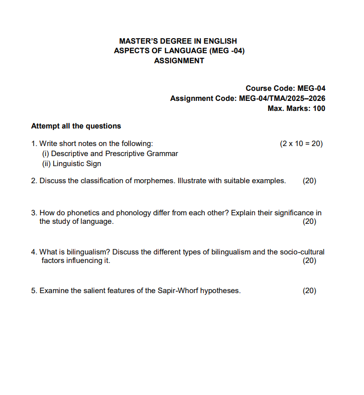 MEG 04 : Aspects of Language in English Solved Assignment 2025-26