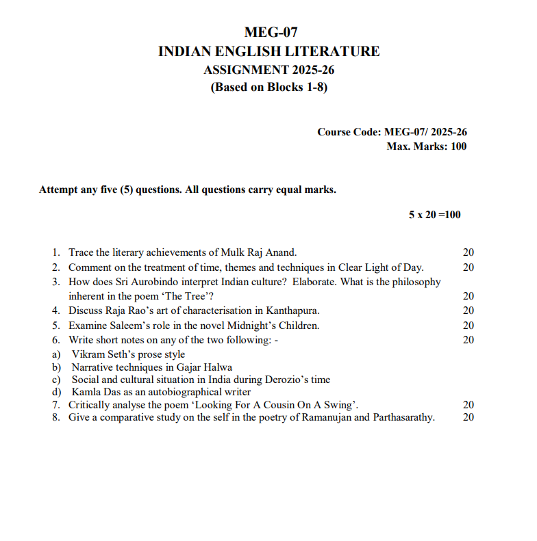 MEG 07 : INDIAN ENGLISH LITERATURE in English Solved Assignment 2025-26