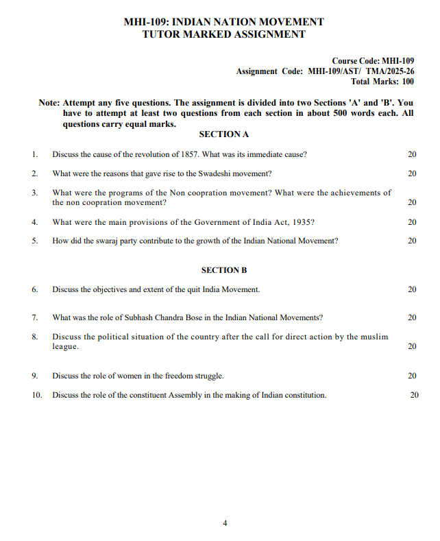 Assignment Title : MHI 109 : INDIAN NATIONAL MOVEMENT in English Solved Assignment 2025-26