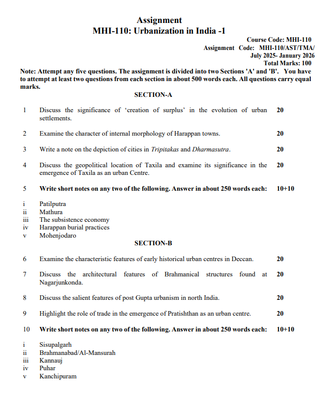 Assignment Title : MHI 110 : Urbanization in India-1 in English Solved Assignment 2024-25