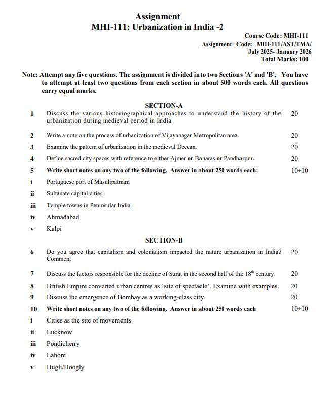 Assignment Title : MHI 111 : Urbanisation in India-2 in English Solved Assignment 2025-26