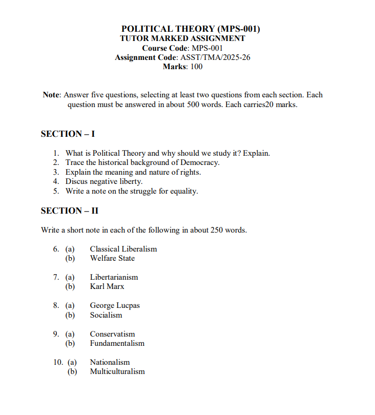 Assignment Title : MPS – 001 : Political Theory in English Solved Assignment 2025-26