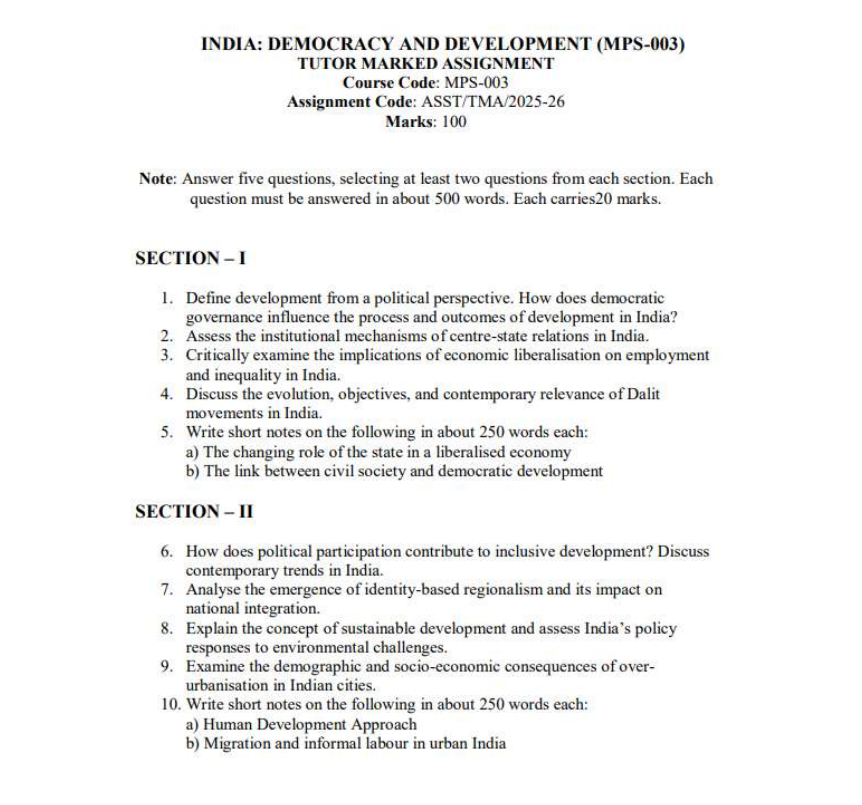 Assignment Title : MPS – 003 India : Democracy and Development in English Solved Assignment 2025-26