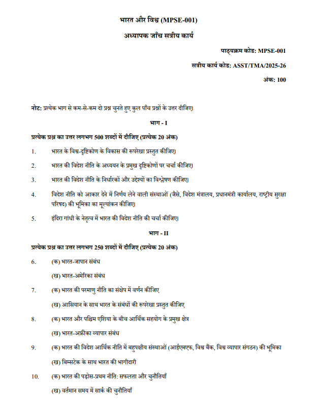 Assignment Title : MPSE – 001 भारत एवं विश्व in Hindi Solved Assignment 2025-26