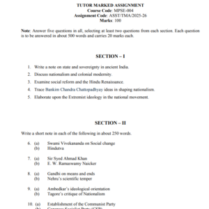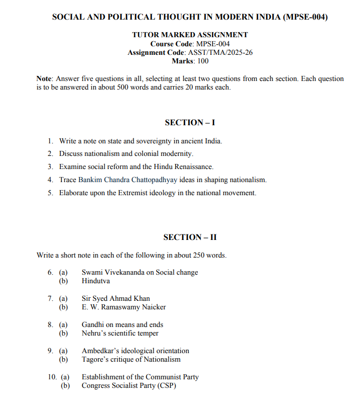 Assignment Title : MPSE 004 : Social and Polittical Thought in Modern India in English Solved Assignment 2025-26